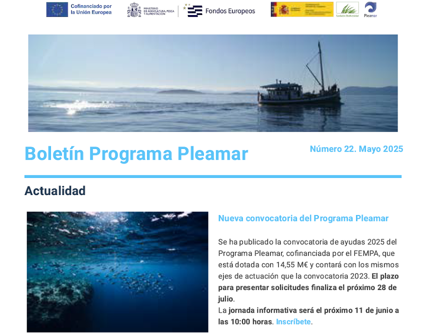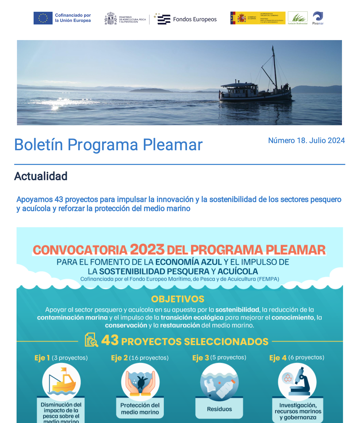 El Boletín electrónico del Programa pleamar es una publicación de periodicidad trimestral que recopila información de interés relativa a los proyectos del Programa y otra información de actualidad en materia de pesca y acuicultura sostenible.