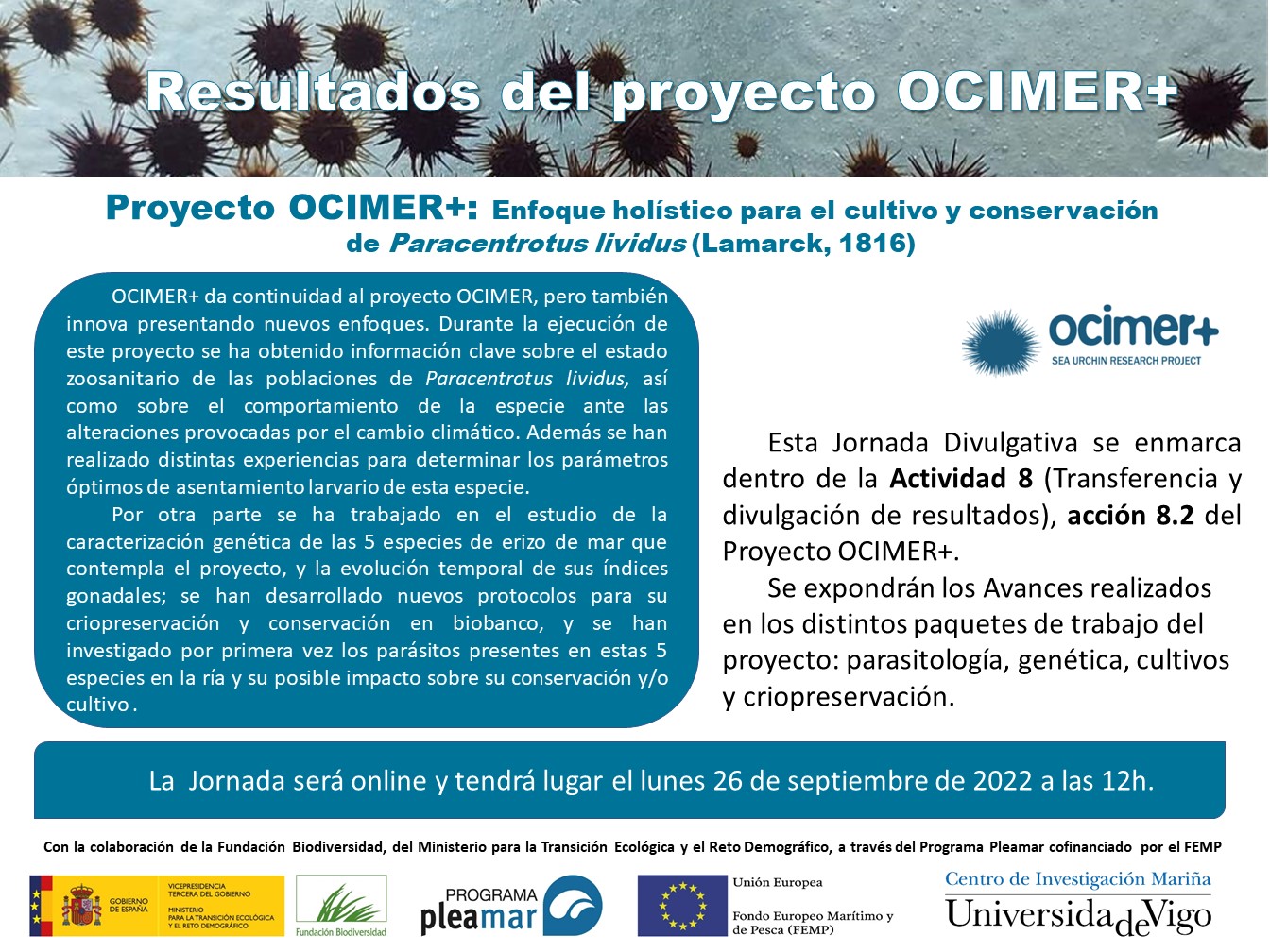 Esta Jornada Divulgativa se enmarca dentro de la Actividad 8 (Transferencia y divulgación de resultados), acción 8.2 del Proyecto OCIMER+. Se exponen los avances realizados en los distintos paquetes de trabajo del proyecto: parasitología, genética, cultivos y criopreservación a asistentes del País Vasco.