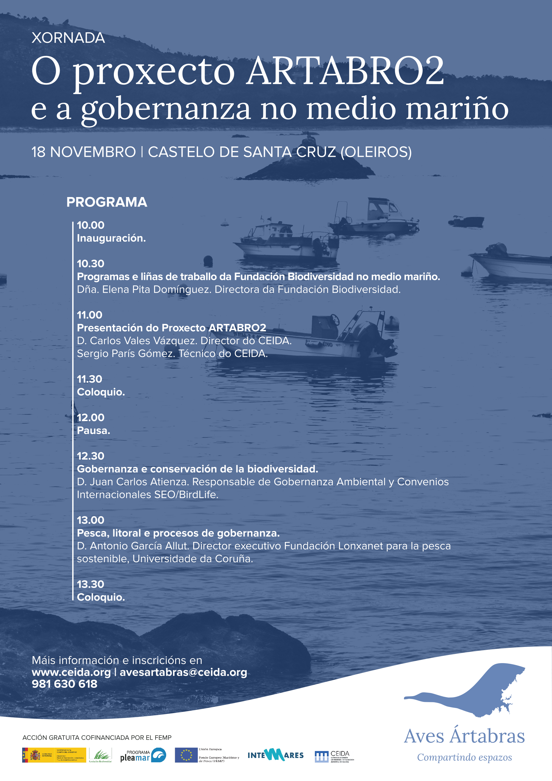 El CEIDA organiza la Jornada ‘El proyecto ÁRTABRO2 y la gobernanza en el medio marino’, que tendrá lugar el próximo 18 de noviembre en el Salón de Actos del Castillo de Santa Cruz (Oleiros), en horario de 10 a 14 h.