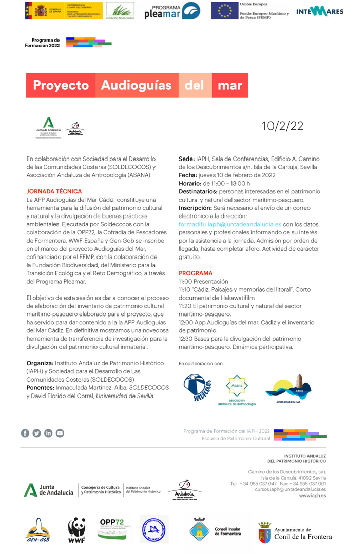 Jornada técnica "Audioguías del mar", organizada por el Instituto Andaluz del Patrimonio Histórico - IAPH Consejería de Cultura - Junta de Andalucía en colaboración con SOLDECOCOS y la Asociación Andaluza de Antropología (ASANA), el jueves día 10 de febrero, de 11:00 a 13:30.