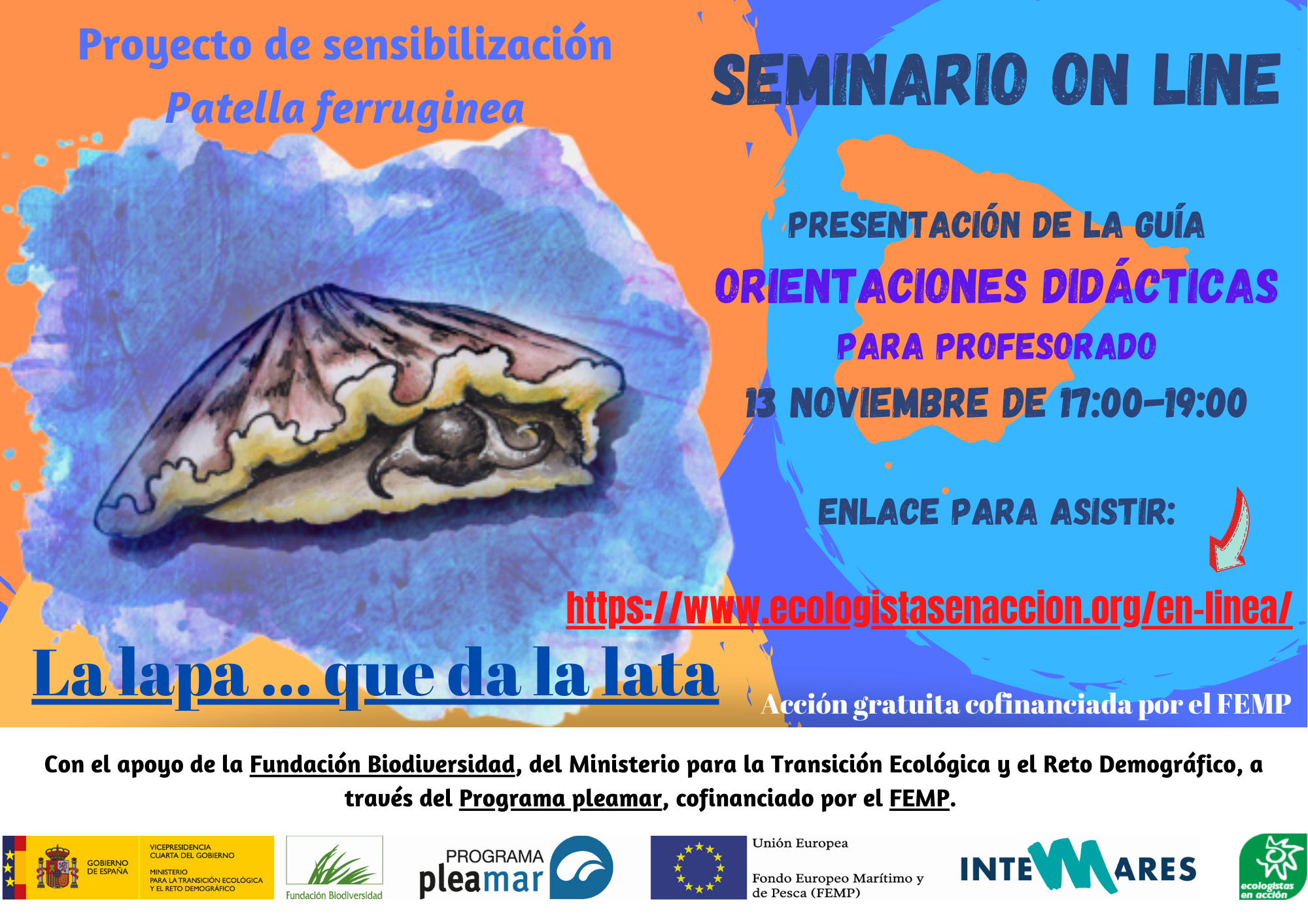 Seminario para profesorado con el que queremos haceros llegar la guía de Orientaciones Didácticas desarrollada en el marco del proyecto de sensibilización“La lapa que da la lata”. En este documento incluimos actividades prácticas y algunas ideas para incluir en el aula de forma amena, desde el enfoque de la situación de Patella ferruginea como especie en peligro de extinción. Creemos que el acercamiento de l@s jóvenes a la biología y la conciencia medioambiental mejora presentando casos en contextos cercanos, la Patella puede ser una vía de acceso para captar su interés por la materia, despertar su espíritu crítico y apoyar el desarrollo de competencias.