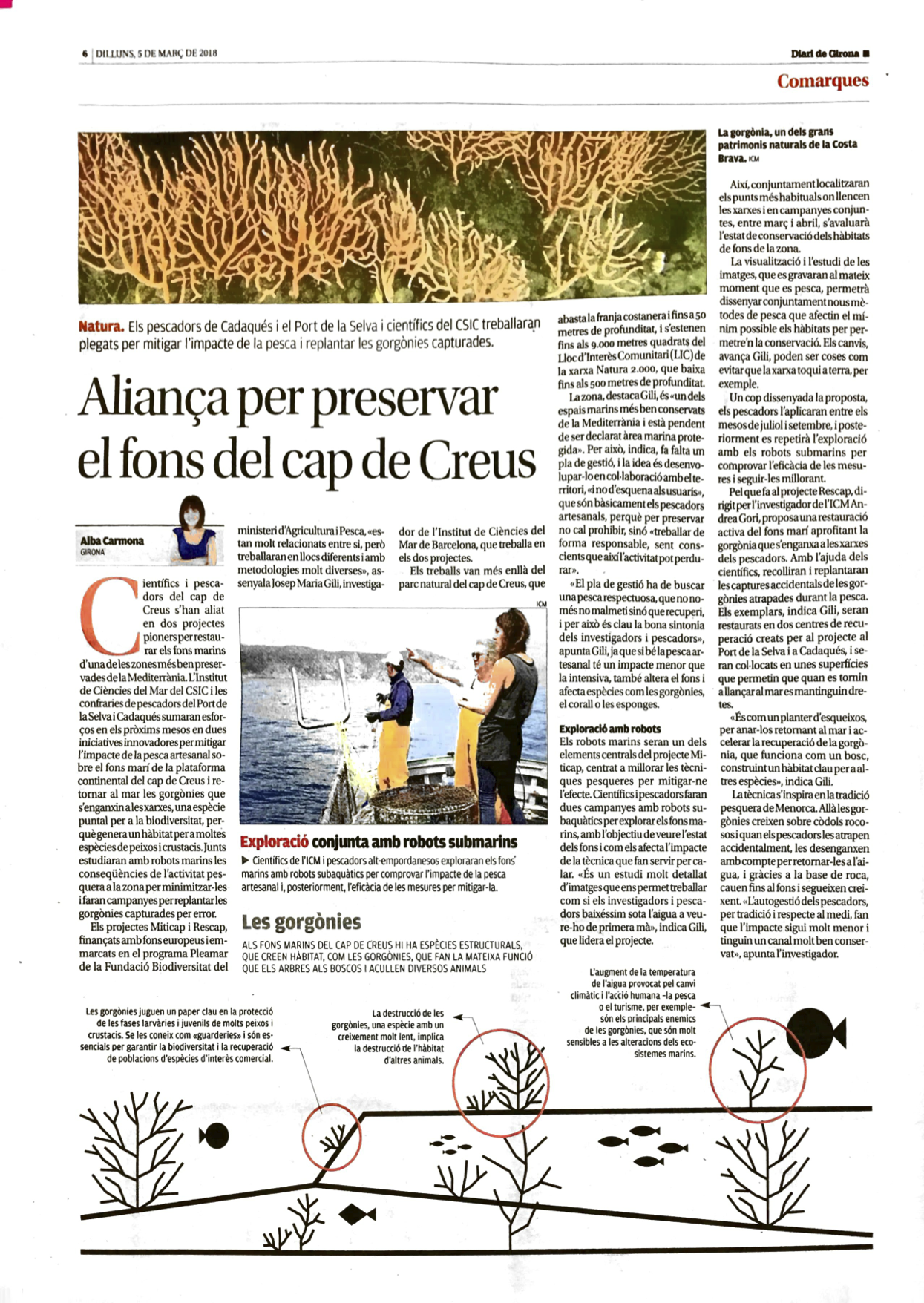 Pel que fa al projecte Rescap, dirigit per l'investigador de l'ICM Andrea Gori, proposa una restauració activa del fons marí aprofitant la gorgònia que s'enganxa a les xarxes dels pescadors. Amb l'ajuda dels científics, recolliran i replantaran les captures accidentals de les gorgònies atrapades durant la pesca. Els exemplars, indica Gili, seran restaurats en dos centres de recuperació creats per al projecte al Port de la Selva i a Cadaqués, i seran col·locats en unes superfícies que permetin que quan es tornin a llançar al mar es mantinguin dretes.