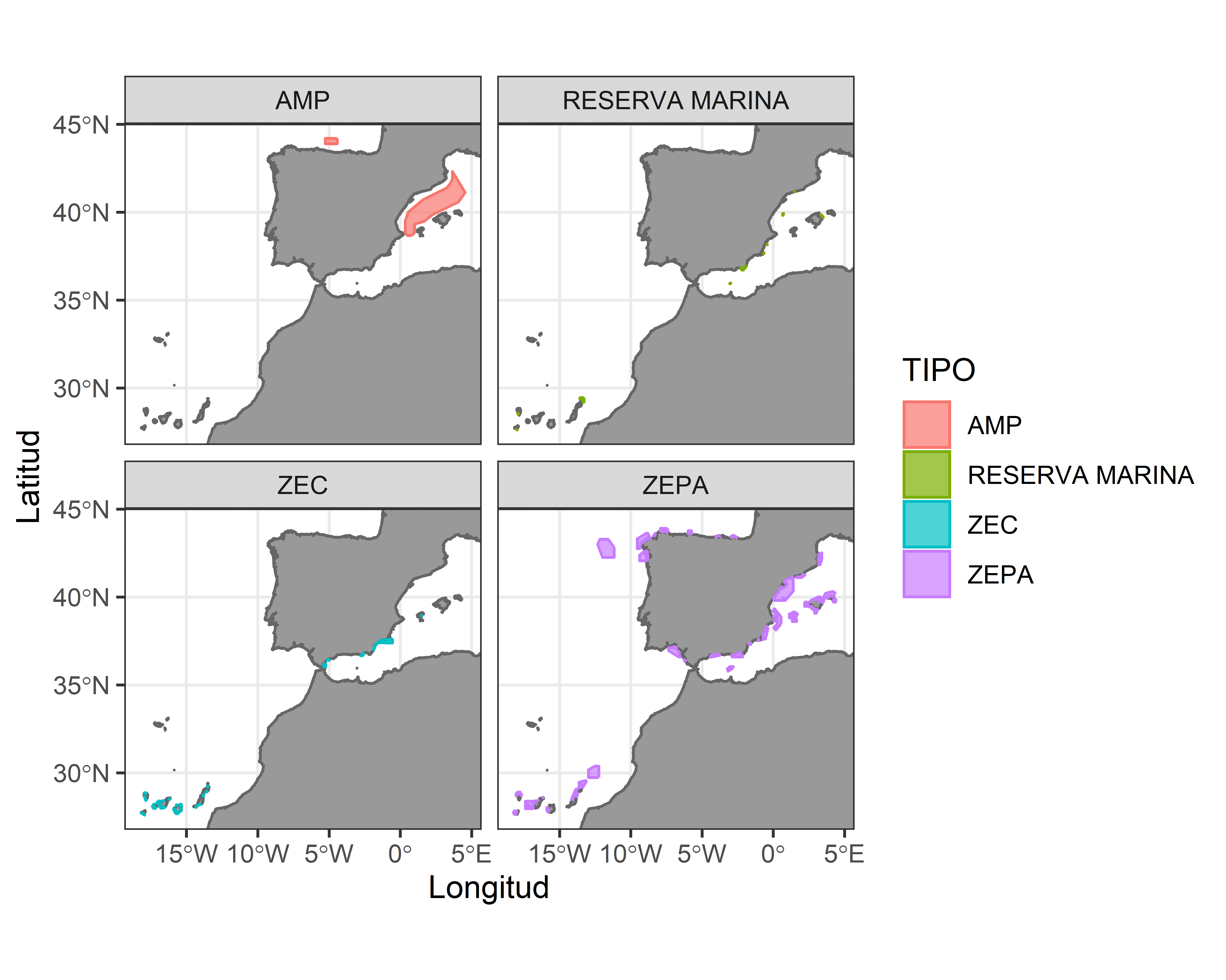 La Red de Áreas Marinas Protegidas de España (RAMPE; Ley 41/2010, del 29 de diciembre, de protección del medio marino) está compuesta por espacios protegidos situados en el medio marino español, y su objetivo principal es asegurar la protección, conservación y recuperación del patrimonio natural y de la biodiversidad marina española. La RAMPE engloba diferentes figuras de protección: Áreas Marinas Protegidas (AMP), Zonas Especiales de Conservación (ZEC), Zonas de Especial Protección para las Aves (ZEPA) y Reservas Marinas, entre otras (Figura 1; para más información, consultar aquí). No obstante, muchos de estos espacios no tienen planes específicos de gestión que tengan en cuenta aspectos tan relevantes como las interacciones entre las aves marinas y las actividades pesqueras y acuícolas.