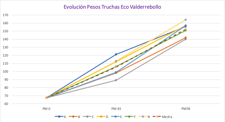 Tras realizar tercer el control de pesos de las truchas este mismo mes, se ha observado un crecimiento, de tal forma que han doblado el peso desde el inicio. Sin embargo, todavía no se observan diferencias claras entre los diferentes ingredientes ecológicos.