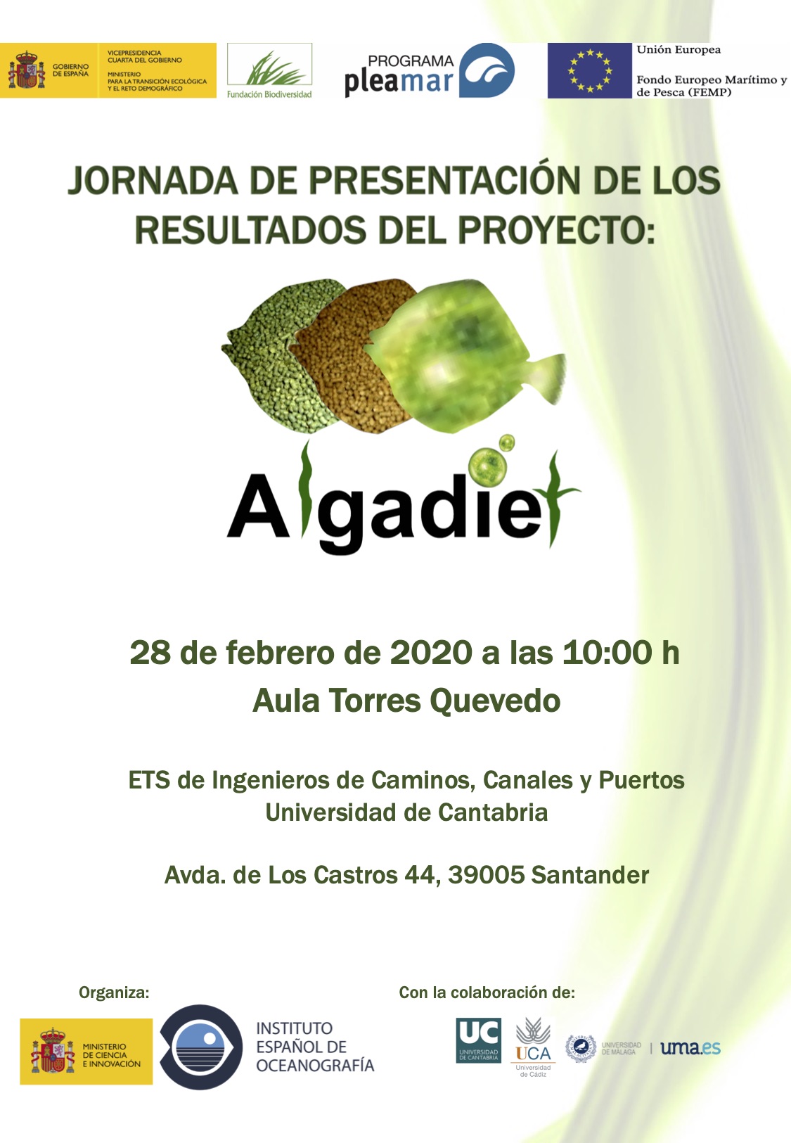 El pasado día 28 de febrero se presentó en el Aula Torres Quevedo de la ETS de Ingenieros de Caminos, Canales y Puertos de la Universidad de Cantabria, los resultados del proyecto ALGADIET, de la Fundación Biodiversidad, del Ministerio para la Transición Ecológica y el Reto Demográfico, a través del Programa pleamar, cofinanciado por el FEMP.