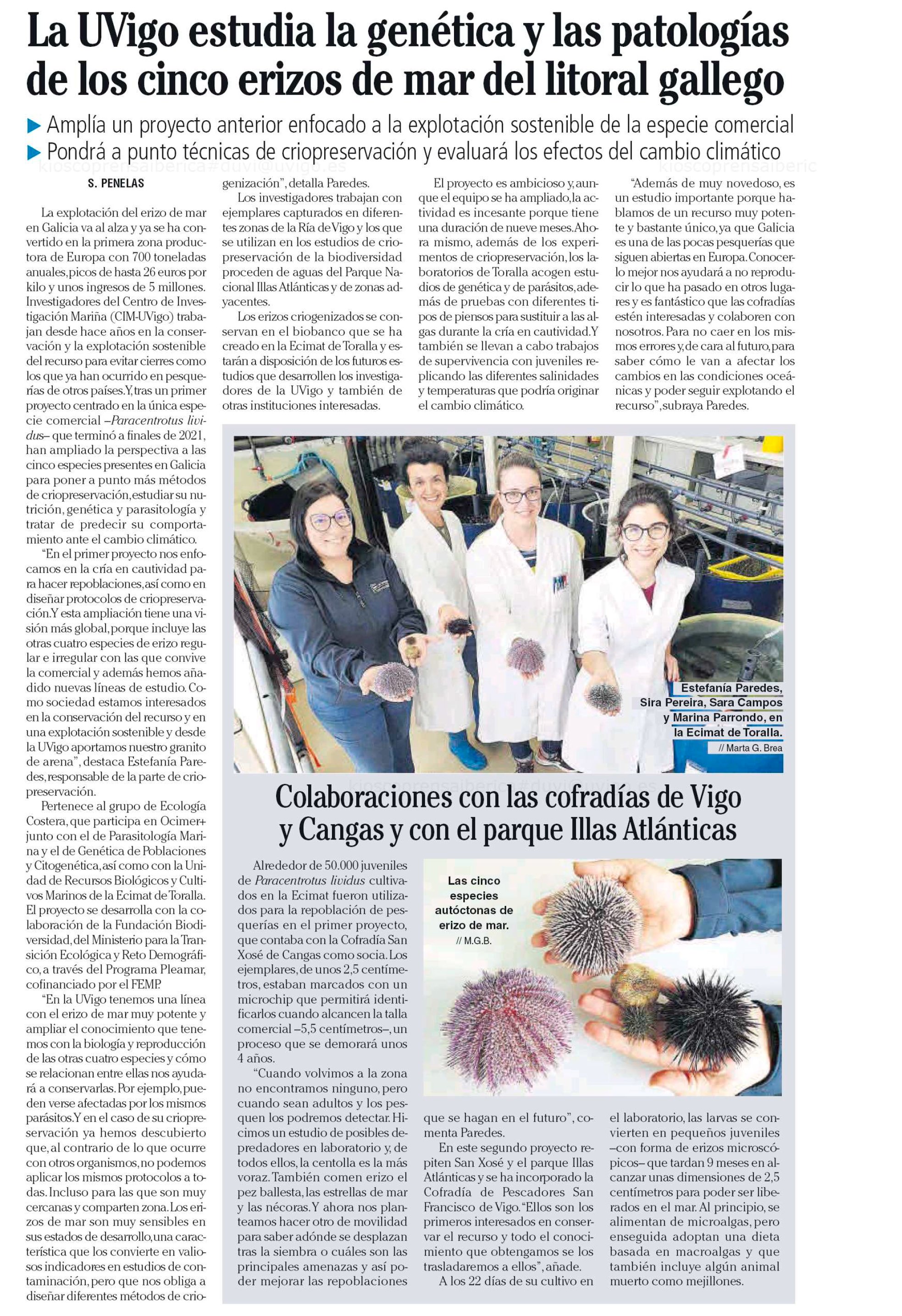 El proyecto OCIMER+ aborda aspectos muy importantes para el desarrollo del cultivo, gestión y conservación del erizo de mar, con un enfoque integrador en el que se abordarán aspectos relacionados con la nutrición, genética, sanidad y criopreservación, así como el estudio del comportamiento de la especie ante las alteraciones provocadas por el cambio climático. Esta visión holística implica a varios grupos de investigación del Centro de Investigación Mariña de la Universidad de Vigo, encargados con su conocimiento de llevar a buen puerto este proyecto.