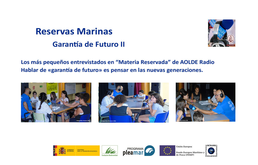 Océano Alfa en el marco del proyecto “Reservas Marinas, Garantía de Futuro II” ha realizado un programa especial de "Materia Reservada", espacio de radio incluido en AOLDE RADIO-Al Otro Lado del Espejo, en el que han participado niños y niñas de los campamentos urbanos del Proyecto “San Fermín”, también han realizado las actividades educativas sobre Reservas Marinas de Interés Pesquero.