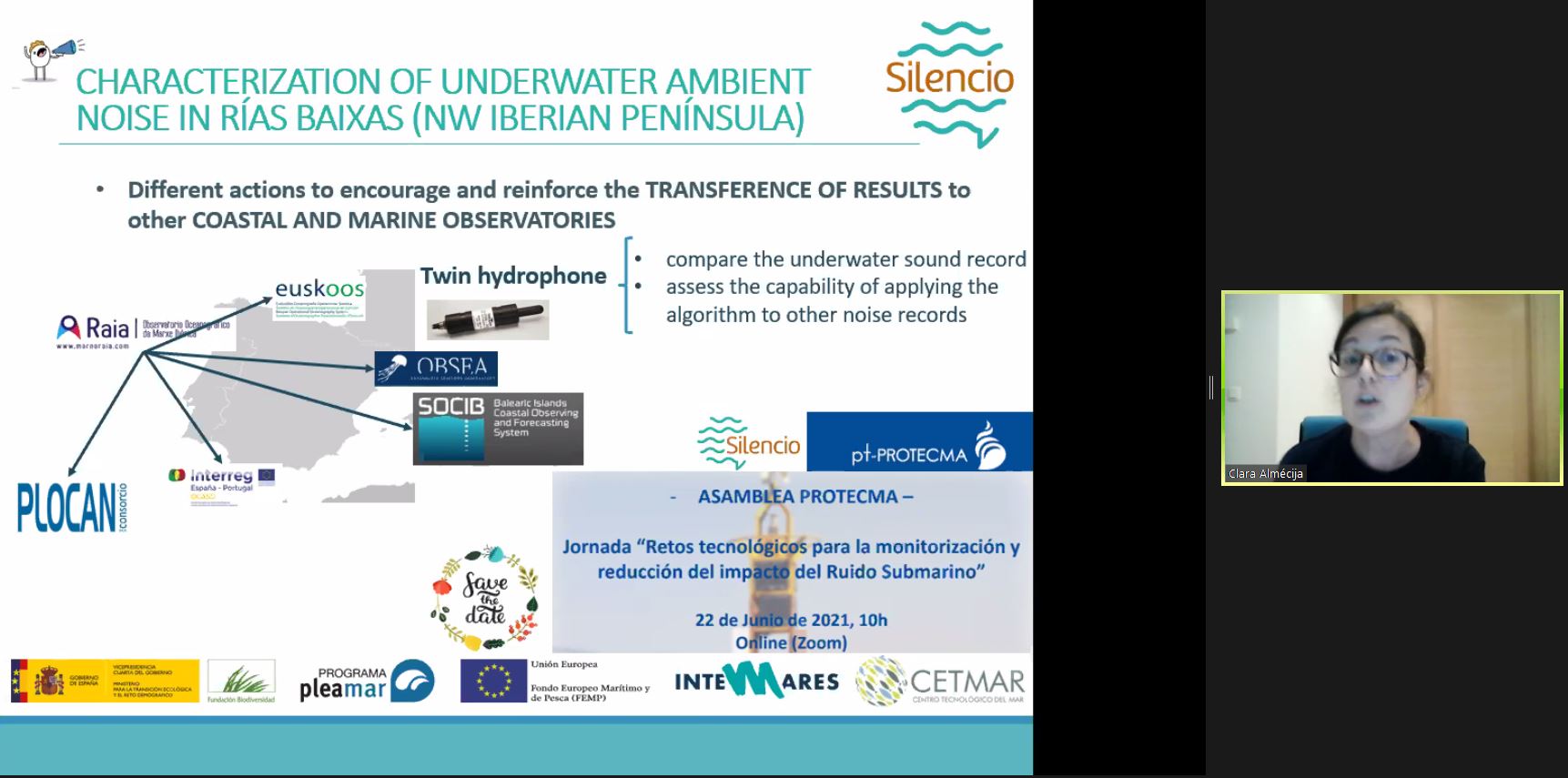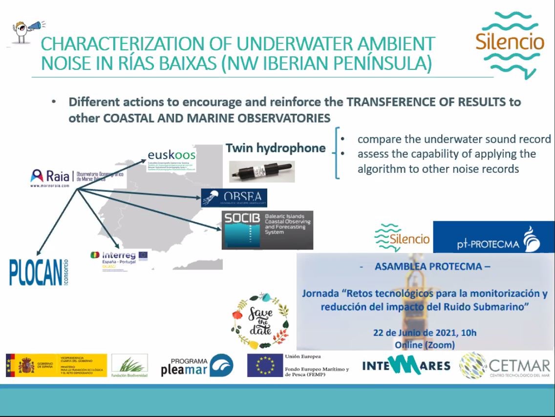 Además de presentarse la problemática del ruido marino y la interferencia que este tiene con los ecosistemas marinos, se ubico SILENCIO en un escenario actual, con la Directiva Marco de la Estretegia Marina poniendo de manifiesto la importancia de aumentar el conocimiento existente que hay sobre ruido submarino ambiente y sobre medidas que puedan mitigar sus efectos. El hidrófono que existe en la plataforma de Cortegada se mostró como un punto de monitoring de ruido ambiente en una zona de alta actividad extrativa, pesquera y marisquera, que además es de especial importancia ambiental por la abundancia de cetáceos y la presencia de la Illa de Cortegada dentro del Parque Nacional das Illas Atlánticas de Galicia. El grupo de Soledad Torres de la Universidade de Vigo realiza el tratamiento de estos datos para identificar automáticamente las fuentes de ruido natural y antropogénico y ese algoritmo será potencialmente trasferible a otros registros de ruido trabajando en la transferencia de los resultados de SILENCIO a otros Observatorios Oceanográficos y Litorales.