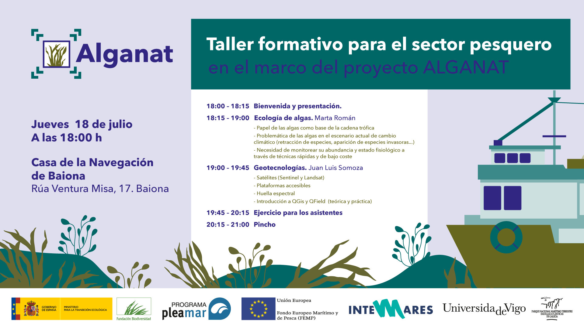 Taller formativo en el marco del proyecto ALGANAT2000 para concienciar al sector pesquero sobre la importancia de las macroalgas en el ecosistema. Un evento dónde se presentarán nuevas estrategias para la mejora de la gestión a través del uso de técnicas geoespaciales para la monitorización y cartografiado de las macroalgas.