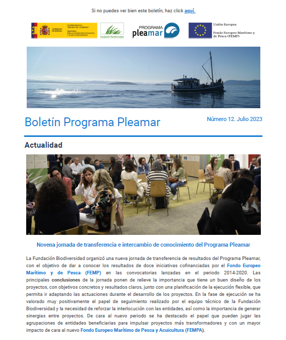 Consulta el boletín nº 12 del Programa Pleamar. Te contamos últimas noticias, resultados de proyectos, además de entrevistas y noticias vinculadas a la Fundación Biodiversidad y el proyecto LIFE INTEMARES.