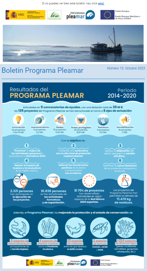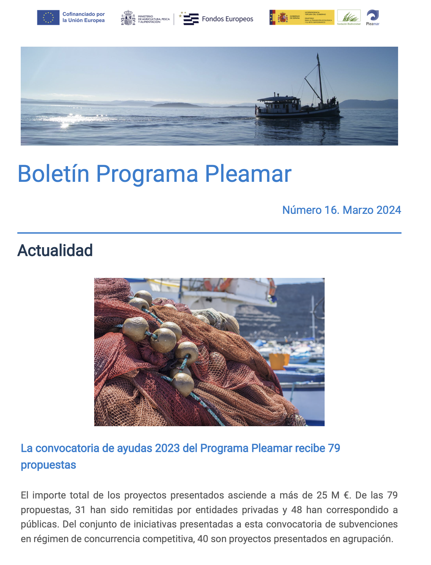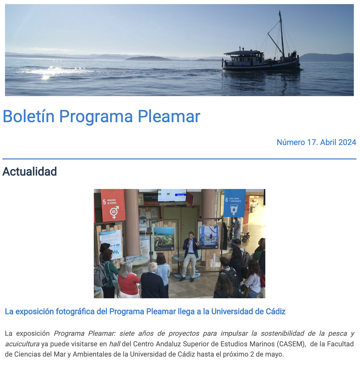 El Boletín electrónico del Programa pleamar es una publicación de periodicidad trimestral que recopila información de interés relativa a los proyectos del Programa y otra información de actualidad en materia de pesca y acuicultura sostenible.