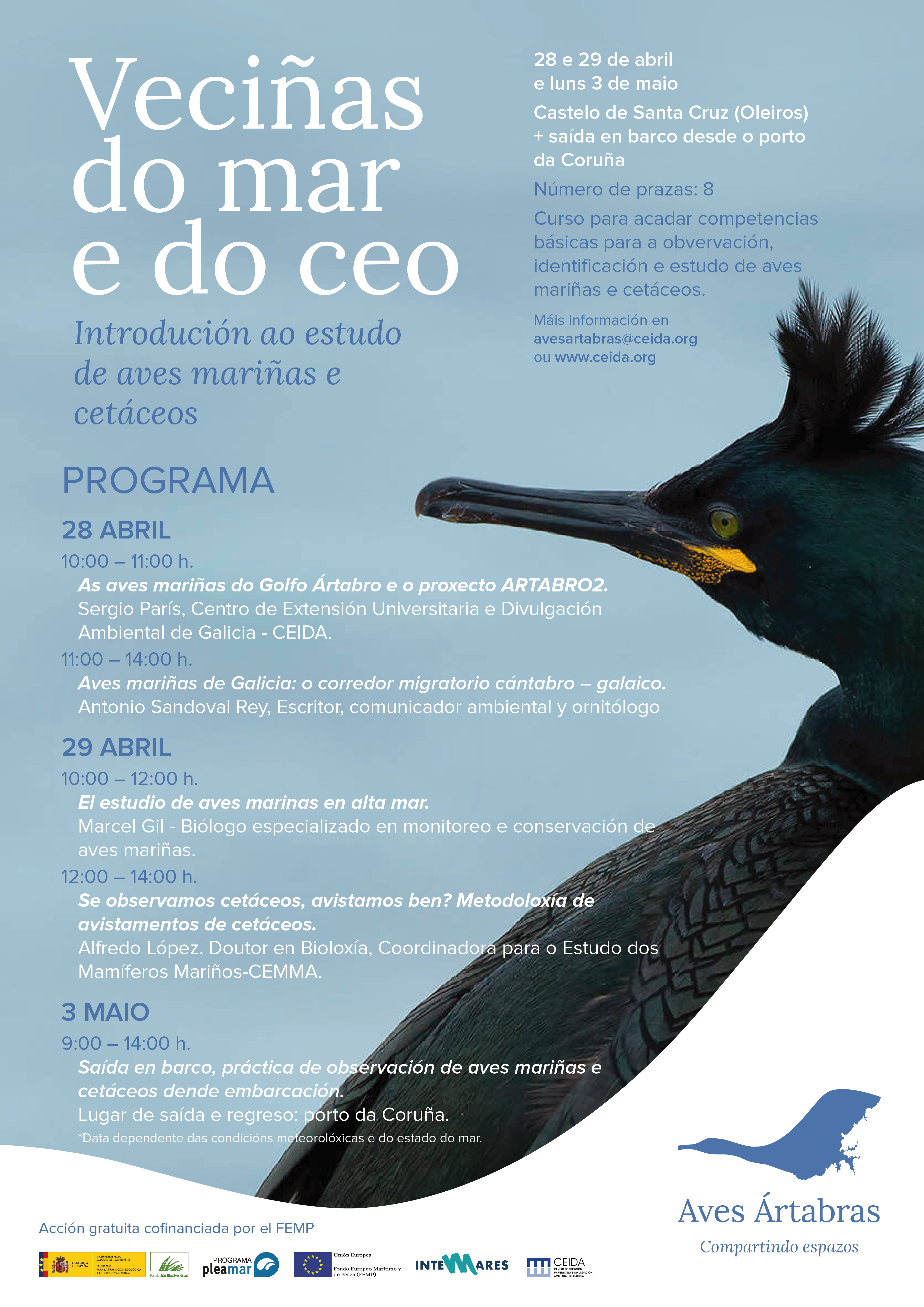 El CEIDA organiza el curso “Introducción al estudio de aves marinas y cetáceos” los días 28-29 de abril y 3 de mayo, como acción formativa del proyecto "ARTABRO2. Hacia la gestión...