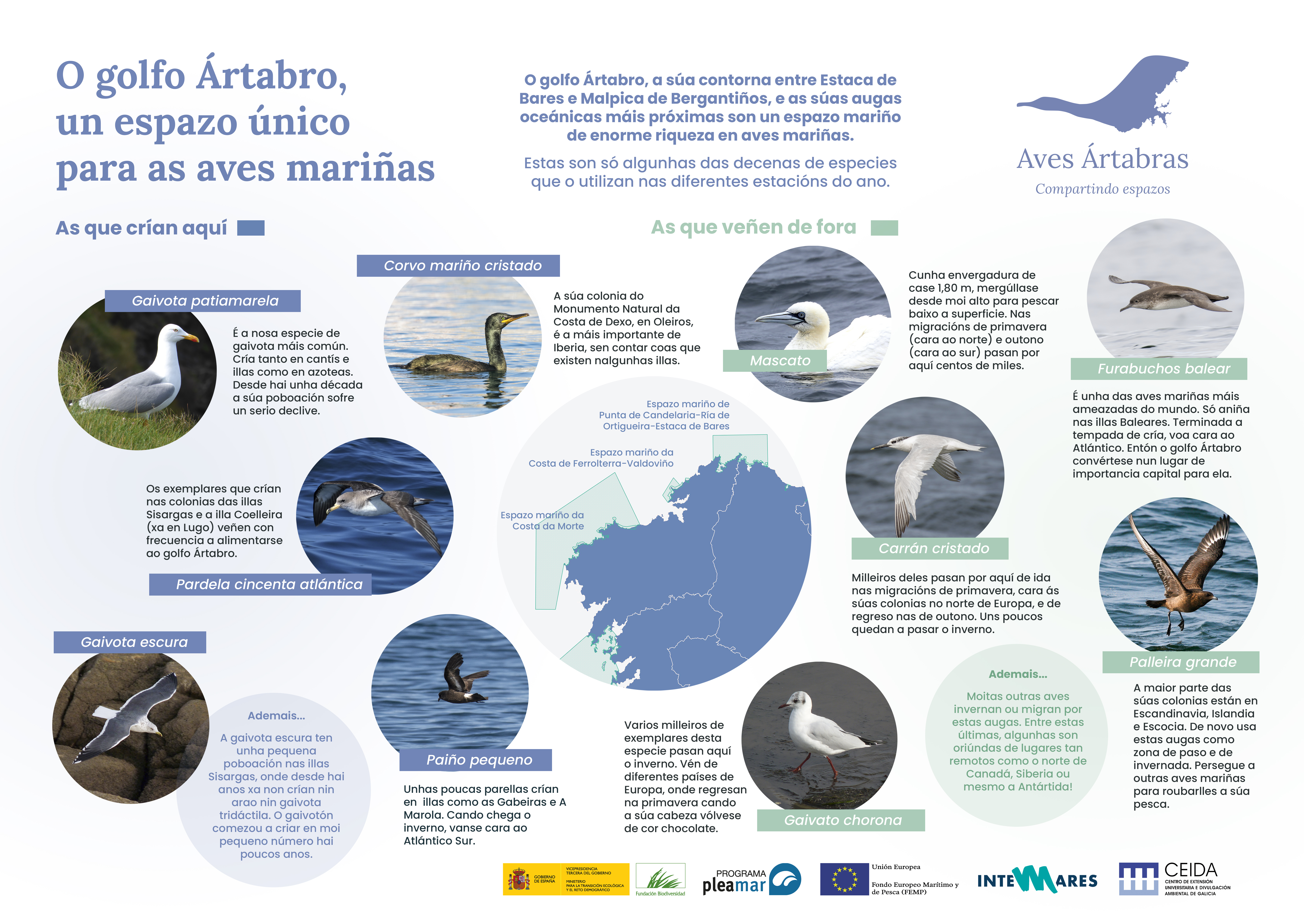 El proyecto Aves Ártabras, desarrollada en la convocatoria 2018, propuso una ZEPA en el Golfo Ártabro que contacta con las ZEPA Espacio marino de la Costa da Morte y Espacio marino de la Costa de Ferrolterra-Valdoviño, en la provincia de A Coruña. Este territorio comparte poblaciones de aves marinas y problemas relacionados con el tráfico marítimo y la mortalidad en artes de pesca, que requieren de una gestión conjunta a nivel regional. El proyecto ÁRTABRO2 avanza en la propuesta para esta ZEPA y propone una gestión integral del territorio entre Islas Sisargas y Estaca de Bares, abarcando el Golfo Ártabro y 3 ZEPA marinas, con 3 bloques de acciones: