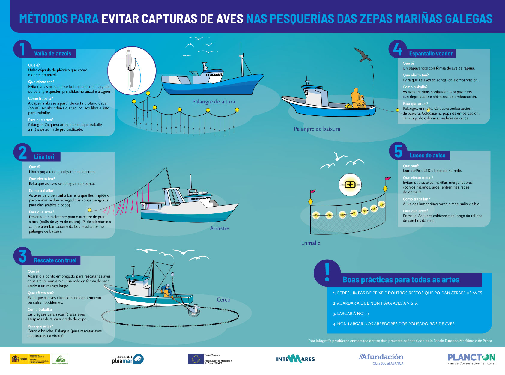 Asimismo, se han celebrado tres jornadas formativas sobre sostenibilidad económica dirigidas a profesionales del mar (pescadoras y pescadores, mariscadoras y mariscadores, redeiras y bateeiros) y se han elaborado, en el eje de difusión del proyecto, dos piezas audiovisuales, una de ellas sobre las zonas ZEPA y su importancia en la sosteniblidad y en la conservación del medio marino, y otra sobre las mujeres del mar y su relación con la conservación de la biodiversidad. Además, se ha diseñado una guía de buenas prácticas y medidas para evitar la captura accidental de aves marinas en las pesquerías de las ZEPAS marinas gallegas, además de dos infografías sobre estas metodologías y consejos para el rescate de aves.