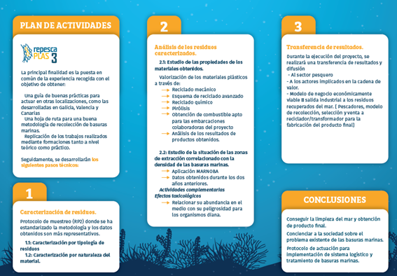 REPESCA_PLAS 3 es la tercera fase de un proyecto cuyo fin principal es analizar y conocer la composición de la basura marina encontrada en España, al mismo que tiempo que analiza las mejores vías para una óptima valorización y fabricación del producto final, utilizando la mayor cantidad posible de material reciclado procedente de residuos marinos.